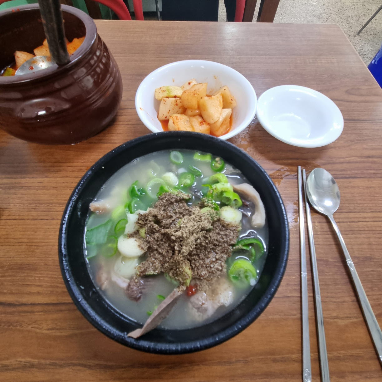 기다림 긑에 받은 약수 순대국의 모습이다. 적당한 양으로 보여졌다. 많지도 않고, 적지도 않은 그런 수준의 양 말이다. 순대국과 함께 먹어야하는 깍두기도 있었는데, 여기 약수 순대국에서 사람들이 칭찬하는 것 중 하나가 저 깍두기의 맛이다. 먹어본 바, 깍두기 특유의 시원한 맛도 좋고 순대국과 궁합이 상당히 훌륭했다.